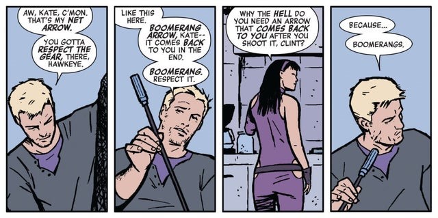 One of the best interplays (which I discovered was also in the comics) is when Kate grabs one of Clints arrows, and he says, “Kate, that’s mine – it’s a boomerang arrow.”